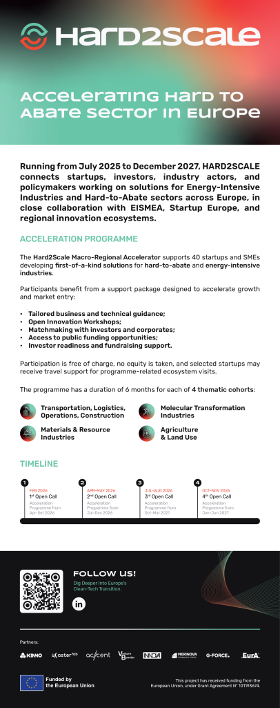 By connecting startups with investors, industry stakeholders and innovation ecosystems across Europe, HARD2SCALE accelerates the development, market uptake and scaling of technologies contributing to industrial decarbonisation and the European green transition.